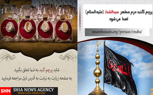 پرچم گنبد حرم مطهر امام حسين عليه السلام و تعداد پنج عدد انگشتر كه نگين