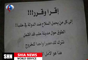 در این اعلامیه که پنجشنبه شب توزیع شد، آمده است: "بخوان و تصمیم بگیر!... محاصره شهر حلب کامل شده و برای خروج از آن معبری باز گذاشته ایم که آخرین امید تو برای خروج است. اگر ظرف دو روز شهر را ترک نکنی، کشته خواهی شد."