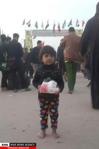 تصویر پذیرایی کودکی با پای برهنه از زائران