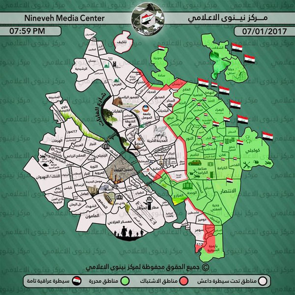 نیروهای عراقی روز دوشنبه کنترل محلههای دومیز، فلسطین، البلدیات و السکر در شرق موصل را در دست گرفتند. محله السکر مشرف بر دانشگاه موصل است. سیطره بر دانشگاه موصل به گفته مسئولان عراقی به معنای کنترل بر منطقه الغابات و کاخهای ریاستجمهوری و کرانه شرقی رود دجله در بخش شمالی است.