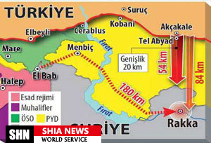 وی با تشریح طرح عملیات رقه و ضربه نهایی به داعش بیان کرد: در اجرای نقشه نخست و از منطقه مرزی ترکیه تا رقه 54 کیلومتر مسیر زمینی فاصله وجود دارد و این مسیر بیشتر مورد نظر ترکیه است.