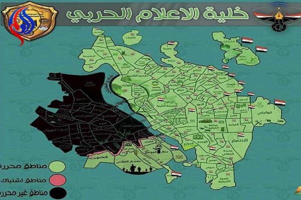 این نقشه نشان می دهد که اکثر مناطق شهر موصل تحت کنترل ارتش عراق و نیروهای مردمی است . ارتش عراق نقشۀ مناطق آزادشدۀ شهر موصل را منتشر کرد.