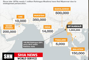 گفتنی است الجزیره آماری نیز از تعداد مسلمانان روهینگیایی آواره در سرتاسر جهان منتشر کرده است. در تصویر این خبر ملاحظه می کنید که بیش از یک میلیون مسلمان میانماری از دهه ۷۰ میلادی از این کشور گریخته اند. درحالیکه سازمان ملل متحد مسلمانان روهینگیا را تحت تعقیب ترین قوم در جهان معرفی کرده بنگلادش و پاکستان با ۵۰۰ و ۳۵۰ هزار آواره روهینگیایی بیشترین تعداد این آوارگان را در خود جای داده اند.