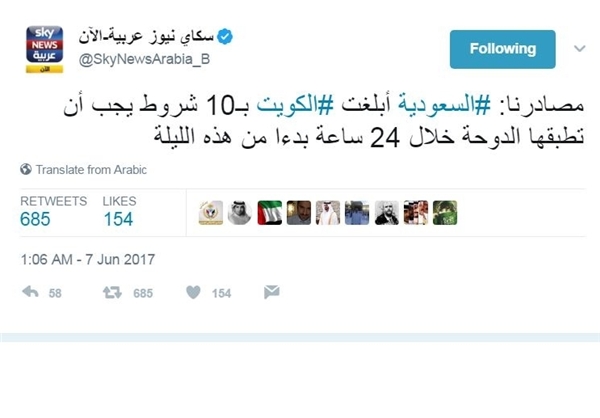 شبکه اسکای نیوز مدعی شده است که عربستان به قطر ۲۴ ساعت فرصت داده تا ۱۰ شرط را اجرایی کند.