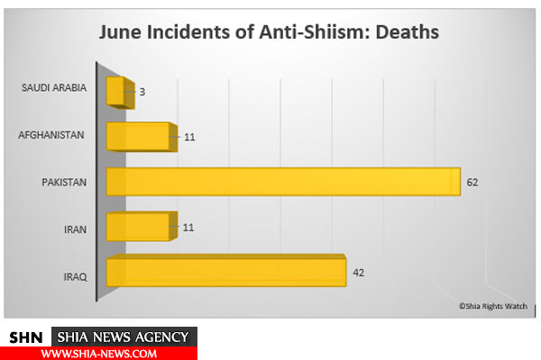 از میان ۱۳۳ مورد حادثه منجر به مرگ علیه شیعیان در ماه ژوئن که در این گزارش ثبت شده، بیشترین رقم مربوط به کشور پاکستان با ۶۲ مورد است. پس از آن ۴۲ مورد در عراق، ۱۱ مورد در ایران، ۱۱ مورد در افغانستان و ۳ مورد در عربستان سعودی اتفاق افتاده است.