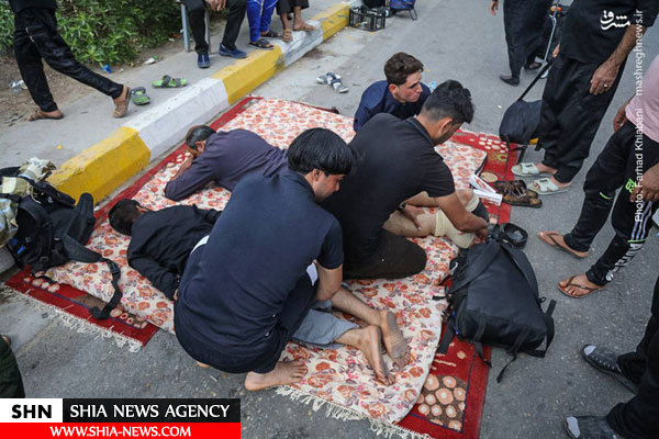 یکی از اقداماتی که جوانان عراقی در مواکب خود انجام می دهند ماساژ درمانی است که این کار را برای زائرانی که با پای پیاده به سمت کربلا در حرکت هستند صورت می گیرد.