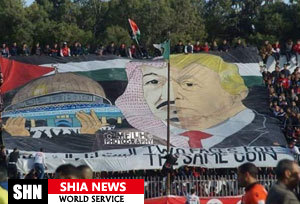بنر عکس ترکیبی چهره ترامپ و سلمان در پی تصمیم رئیس جمهور آمریکا درباره اعلام قدس به عنوان پایتخت اسرائیل از سوی تماشاچیان الجزائری به نمایش درآمد و روی آن عبارت «دو روی یک سکه» نوشته شده بود.