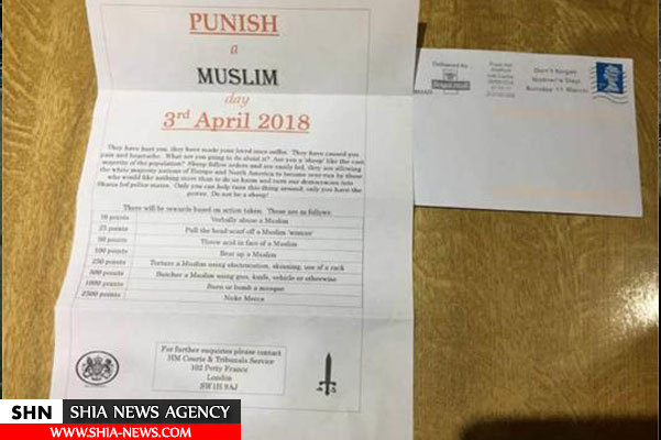 این پوسترها و نامه های بیمارگونه و موهن که به تازگی به منزل چند مسلمان در شرق شهر لندن ارسال شده اند «روز مجازات مسلمان» نامیده شده و در یک بازی هولناک، «آتش زدن مساجد» را ترویج می دهند.
