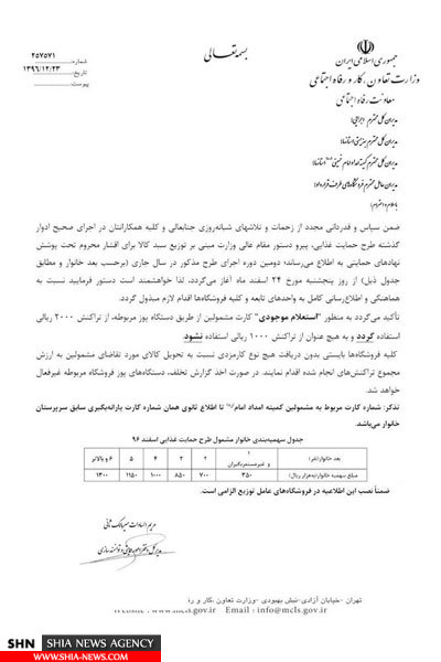 ضمن سپاس و قدردانی مجدد از زحمات و تلاشهای شبانه روزی جنابعالی و کلیه همکارانتان در اجرای صحیح ادوار گذشته طرح حمایت غذایی، پیرو دستور مقام عای وزارت مبنی بر توزیع سبد کالا برای اقشار محروم تحت پوشش نهادهای حمایتی به اطلاع می رساند؛ دومین دوره اجرای طرح مذکور در سال جاری (برحسب بعد خانوار و مطابق جدول ذیل) از روز پنجشنبه ۲۴ اسفند ماه آغاز می گردد.