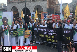 تظاهرات کنندگان با تجمع در برابر کمیساری عالی نیجریه در لندن و ساختمان سازمان ملل متحد در ژنو خواستار آزاد فوری شیخ زکزاکی شدند.