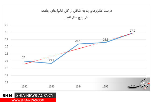 نمودار زیر روند تعداد خانوارهای بدون فرد شاغل را در 5 سال اخیر نشان می دهد. همان گونه که ملاحظه می شود در حالی که در سال 1392، 24 درصد از خانوارها، بدون فرد شاغل بوده اند این آمار در سال 1396 به 27.9 درصد رسیده است. یعنی تعداد خانوارهای بدون فرد شاغل در طی پنج سال، 3.9 درصد رشد داشته اند.