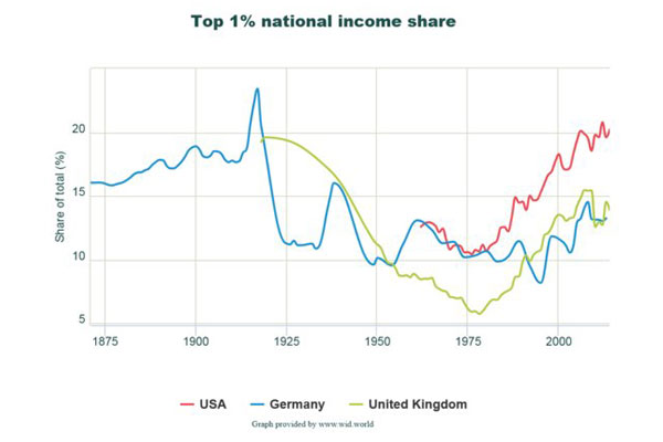 سهم ۱ درصد ثروتمند کشورهای آمریکا، بریتانیا و آلمان از درآمد این کشورها از سال ۱۸۷۰ تا ۲۰۱۰