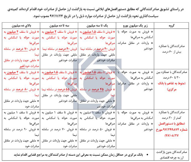 همچنین صادرکنندگانی که بیش از ۶۰ درصد از ارز حاصل از صادرات خود را مطابق مصوبات پیشین به چرخه اقتصادی بازگردانده اند، علاوه بر موارد فوق در صورت نیاز به تخصیص و تامین ارز در اولویت بانک مرکزی قرار خواند گرفت.