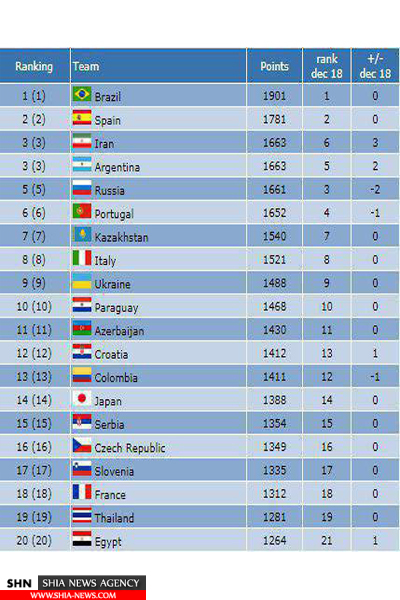 به گزارش «شیعه نیوز»، بنابر جدیدترین رتبه بندی اعلام شده تیم‌های ملی فوتسال جهان در سایت (world futsal ranking)، تیم ملی فوتسال ایران هم‌چنان با کسب ۱۶۶۳ امتیاز، در رتبه سوم جهان قرار دارد.