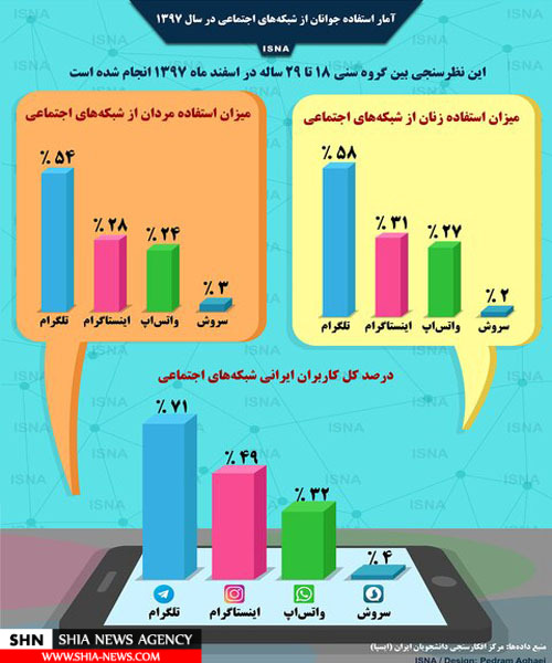 نتایج یکی از نظرسنجی‌های اسفند ۹۷ مرکز افکارسنجی دانشجویان ایران (ایسپا) نشان می‌دهد در سال گذشته، ۷۱ درصد جوانان ۱۸ تا ۲۹ ساله از تلگرام و ۴۹ درصد این جوانان از اینستاگرام استفاده کرده‌اند. علاوه بر آن ۳۲ درصد شرکت‌کنندگان در این نظرسنجی گفته‌اند در سالی که گذشت از واتس‌اپ و ۴ درصد نیز از پیام‌رسان سروش استفاده می‌کردند.
