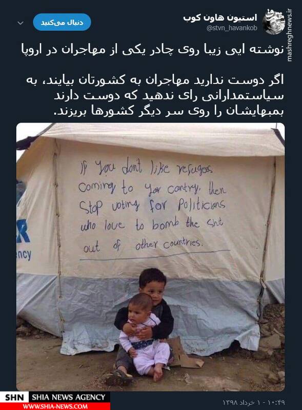 نوشته‌ای زیبا روی چادر یکی از مهاجران در اروپا