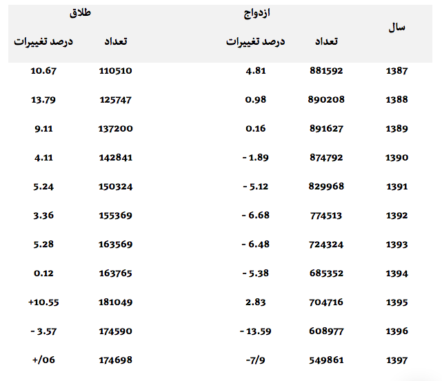 آمار های ارایه شده نشان میدهد که که درصد تغییرات ازدواج در سال 1397 نسبت به سال 1387 حدود 6/37 درصد تغیرات منفی داشته است؛ این در حالی است که جمعیت افراد در سن ازدواج در کشور بیشتر شدهاند در حالی که در همین زمان طلاق 32/58 درصدتغیرات مثبت داشته است که نشان از روند کاهشی ازدواج و افزایشی طلاق در کشور هست که بسیار نگرانکننده است همچنین یافتههای آماری نشان میدهد که نسبت طلاق به ازدواج درسال 1387 از 5/12 به 77/ 31 در سال 1397 افزایش یافته است که نشانه بدتر شدن این شاخص در کشور است.