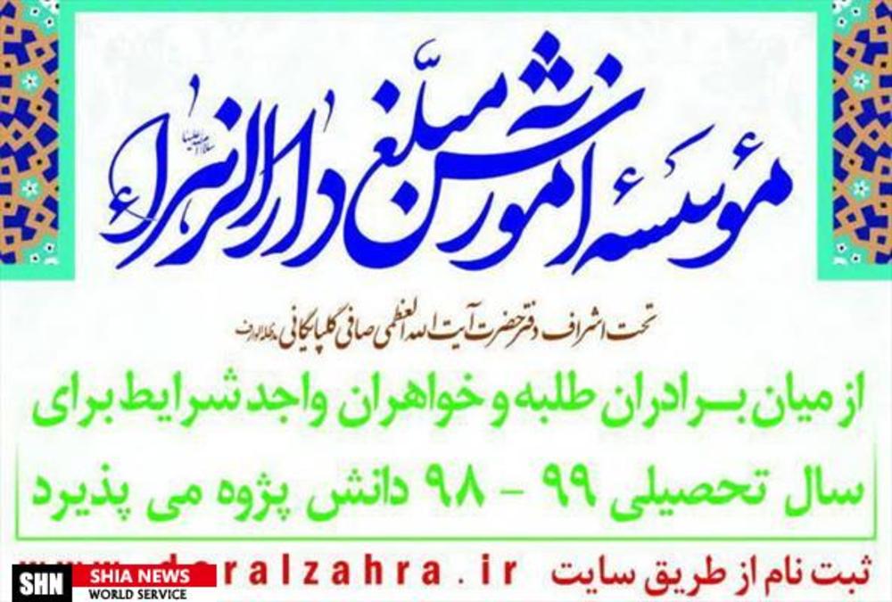 به گزارش «شیعه نیوز»، مؤسسه آموزش مبلغ دارالزهرا (س) تحت اشراف دفتر آیت الله صافی گلپایگانی از میان برادران طلبه و خواهران واجد شرایط برای سال تحصیلی 99-98 دانش پژوه می پذیرد.