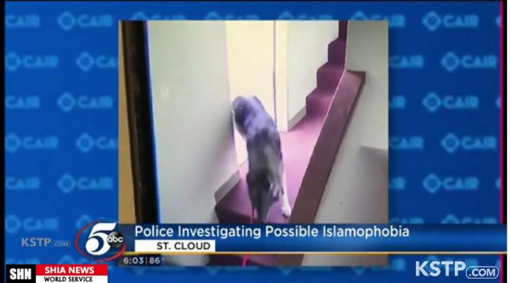به گزارش «شیعه نیوز»، یک ویدئوی منتشر شده توسط شورای روابط اسلامی آمریکایی (کایر) در مینه سوتا نشان می دهد هفته گذشته مرد ناشناسی وارد مرکز اسلامی در شهر سنت کلاود در این ایالت شده و یک سگ را همراه خود آورده است. وی سپس موهای سگ را روی زمین پرتاب می کند.