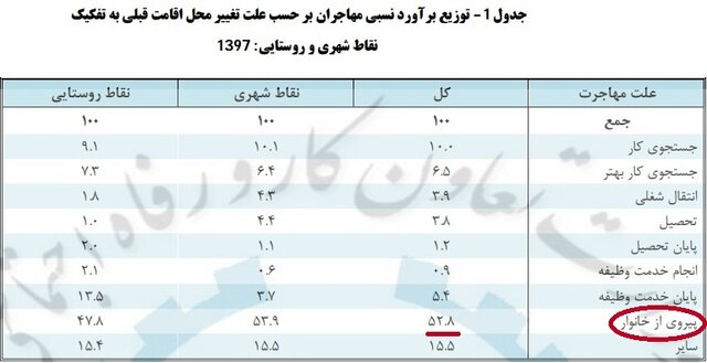 این گزارش همچنین بیشترین علت مهاجرت افراد در نقاط شهری را پیروی از خانوار با ۵۳.۹ درصد، جستجوی کار با ۱۰.۱ درصد و جستجوی کار بهتر با ۶.۴ درصد عنوان میکند.