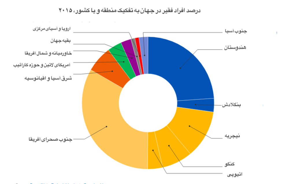نمودار زیر، پراکندگی فقر شدید در جهان را نشان میدهد. بر این اساس، ۳۳.۲۵ درصد از فقیرترین مردم جهان در جنوب صحرای آفریقا زندگی میکنند. بعد از آن، ۲۳.۸۸ درصد در هندوستان و پس از آن نیز ۱۱.۷۶ درصد در نیجریه زندگی میکنند.