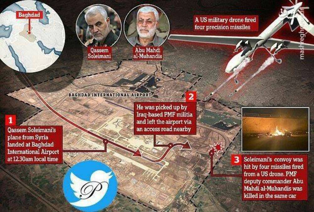 چهار فروند موشک از سوی پهپاد آمریکایی به سوی دو خودرو شلیک شد. سپهبد سلیمانی و المهندس در یک خودرو کنار هم به شهادت رسیدند.