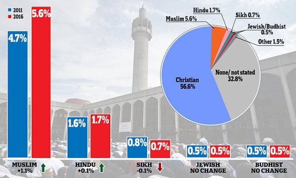 دفتر آمار ملی انگلیس برآورد کرده که تنها در ناحیه انگلیس در بریتانیا سه میلیون و ۹۲ هزار مسلمان در سال ۲۰۱۶ وجود داشتهاند. در این ارزیابی عنوان شد که در سال ۲۰۱۶ جامعه مسلمانان ۵.۶ درصد از کلیت جمعیت انگلیس را تشکیل دادهاند در حالیکه در سال ۲۰۱۱ این نرخ معادل ۴.۷ درصد بود. این گزارش نشان داد که گروه مسیحیان انگلیس با افت جمعیت روبرو شده هر چند که همچنان بزرگترین جامعه مذهبی انگلیس است.