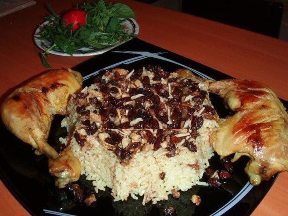 تزیین غذا: بعد از دم کشیدن پلو، با کفگیر پلو را مخلوط میکنیم تا ادویه و دارچین با پلو مخلوط شوند. سپس کمی روغن زده و دردیس گرد میکشیم. بهتر است پلو را در وسط و مرغها را دور تا دور دیس ومواد را بین مرغها قرار دهید. (کشمش و گردو و خلال بادام را با نیمی ازپیازسرخ شده تفت داده وپودر لیمو عمانی روی آن میپاشیم)