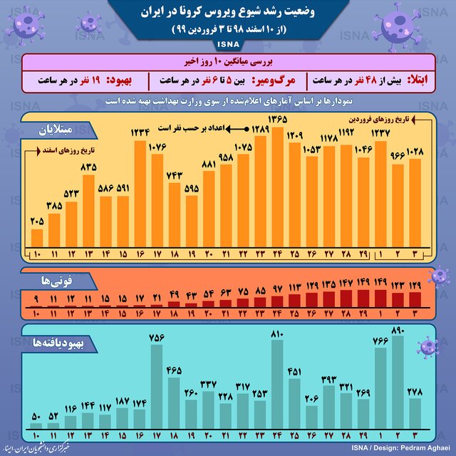 این ویروس تا ظهر یکشنبه ۱۶۸۵ نفر را در ایران به کام مرگ کشانده است. از سوی دیگر، حدود هشت هزار نفر تاکنون بهبود یافتهاند. همچنین، بررسی آمارهای وزارت بهداشت در ۱۰ روز اخیر یعنی از ۲۳ اسفند ۹۸ تا ۳ فروردین ۹۹ نشان میدهد که در ایران به طور متوسط در هر ساعت ۴۸ نفر مبتلا و بین ۵ تا ۶ نفر قربانی ویروس میشوند و ۱۹ نفر نیز بهبود مییابند.