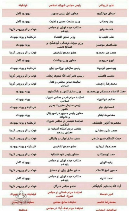 به گزارش «شیعه نیوز»، از مقامات مبتلا می‌توان به ۳ عضو کابینه، ۵ نماینده مجلس و تعداد دیگری از شخصیت‌های سیاسی اشاره کرد.
