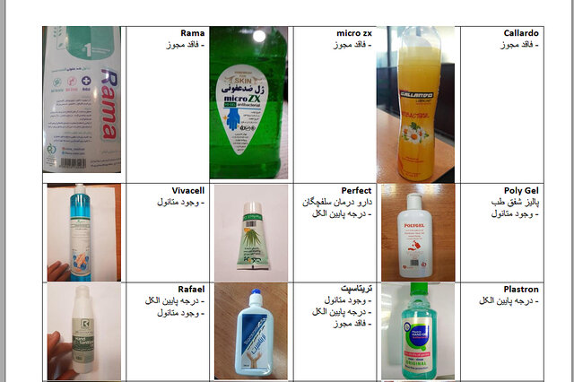 - ژل ضدعفونی کننده شرکت فرایندسازان شیمی پارس با نشان تجاریRafael به دلیل درجه پایین الکل و وجود متانول