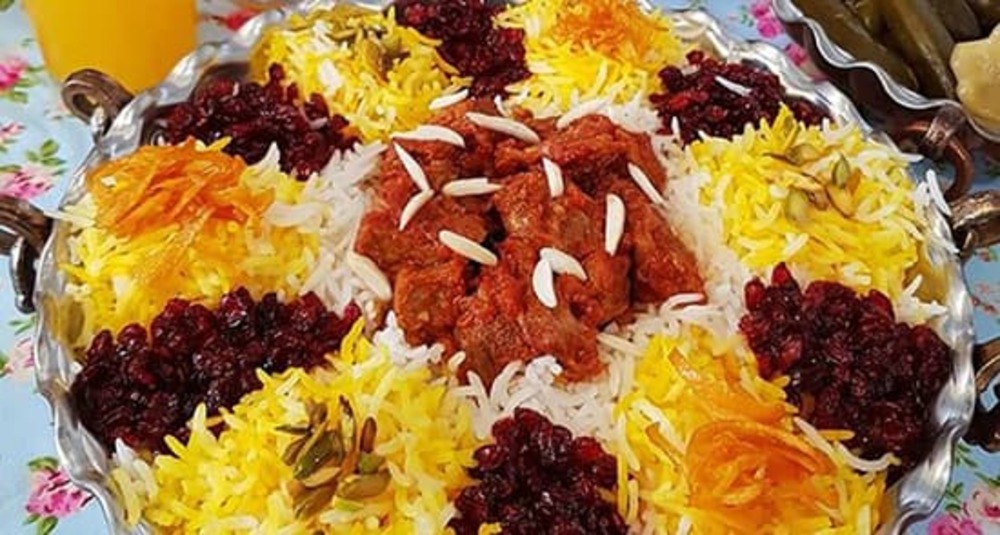 ۶٫زمان سرو برنج و مخلوط آلبالو و لپه و گوشت رو روی برنج بدید.