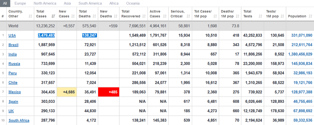 پایگاه اطلاعرسانی worldometers، مجموع مبتلایان به ویروس کرونا در آمریکا را ۳ میلیون و ۴۷۹ هزار و ۴۸۳ مورد و مجموع قربانیان آن را در این کشور، ۱۳۸ هزار و ۲۴۷ نفر گزارش کرده است.
