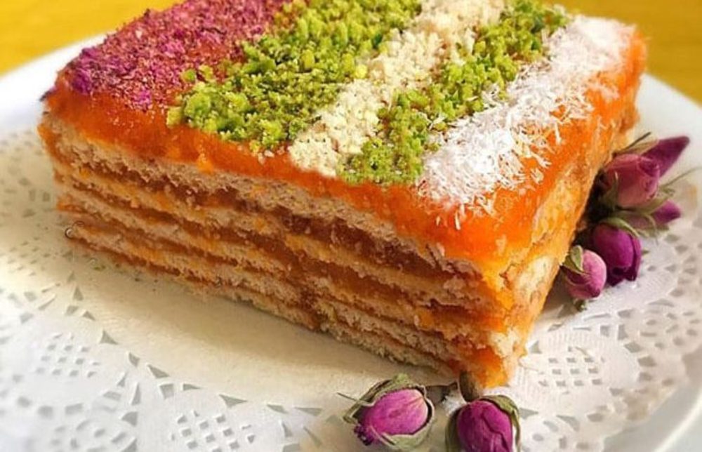 گلاب و زعفران را اضافه کنید اجازه دهید چند قل بزند و مواد کمی سفت شود و آب داخل مواد تبخیر شود. از مواد داخل قالب مورد نظر بریزید لایه به لایه بیسکویت بگذارید. اجازه بدهید از حرارت بیفتد و خنک شود سپس در یخچال چند ساعت استراحت بدهید تا خودش را بگیرد.