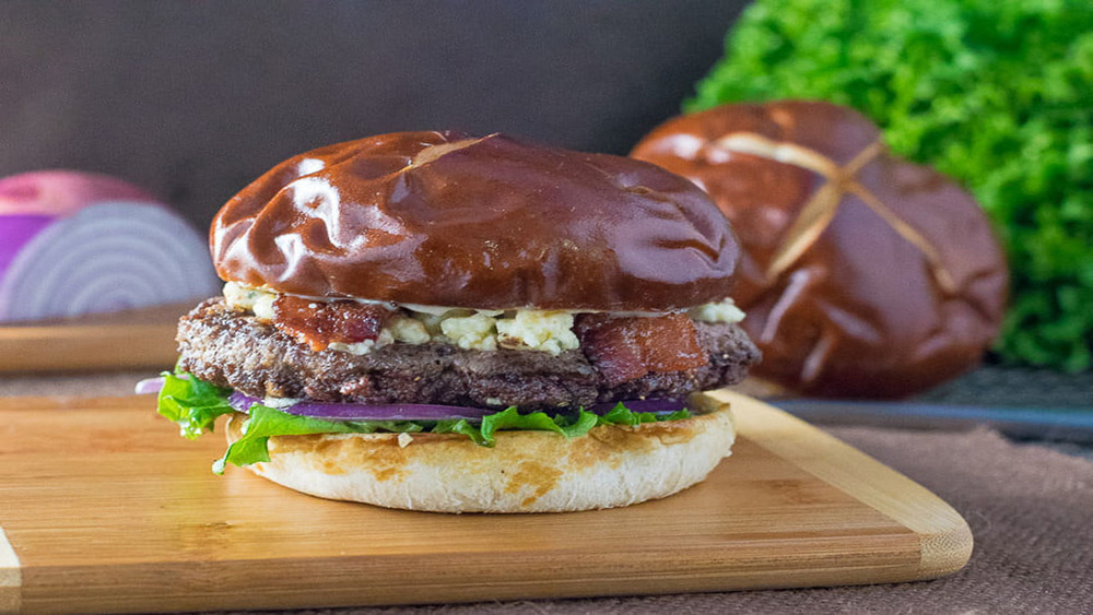 حالا میتوانید کف نانها را با پیاز و کاهو پر کنید، سپس برگر را روی آن بچینید و یک لایه متوسط بلوچیز روی آنها بگذارید. در آخر روی آن را با خیارشور و گوجه تزئین کنید و با نان ببندید. غذای شما آماده سِرو است.