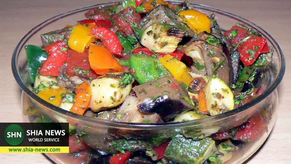 بادمجان، کدو و گوجه فرنگی را به مدت دو ساعت در روغن زیتون میخوابانیم.
