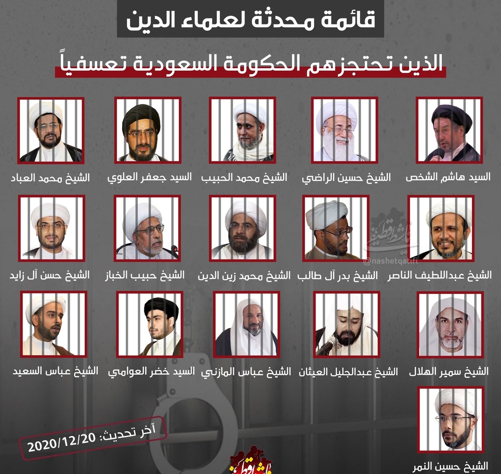سید هاشم الشخص، شیخ حسین الراضی، شیخ محمد الحبیب، سید جعفر العلوی، شیخ محمد العباد، شیخ عبدالطیف ناصر، شیخ بدر آل طالب، شیخ محمد زین الدین، شیخ حبیب الخباز، شیخ حسن آل زاید، شیخ سمیر الهلال، شیخ عبدالجلیل العیثان، شیخ عباس المازنی، شیخ خضر العوامی، شیخ عباس سعید و شیخ حسین النمر ۱۶ روحانی شیعی در بند رژیم آل سعود هستند.