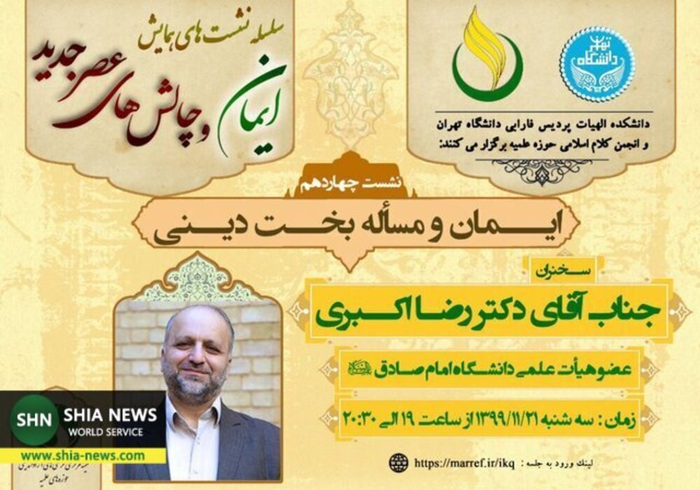 چهاردهمین نشست از مجموعه نشست های همایش ” ایمان و چالش های عصر جدید” با موضوع ایمان و مسئله بخت دینی به همت انجمن کلام اسلامی حوزه علمیه و دانشکده الهیات پردیس فارابی دانشگاه تهران و با همکاری کمیته برگزاری کرسی های آزاداندیشی حوزه های علمیه برگزار گردید.