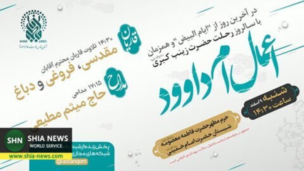 به گزارش «شیعه نیوز»، اعمال ام داوود در روز شنبه نهم اسفند ماه همزمان با آخرین روز از ایام البیض و در سالروز رحلت حضرت زینب کبری سلام الله علیها در حرم مطهر حضرت معصومه سلام الله علیها برگزار خواهد شد.