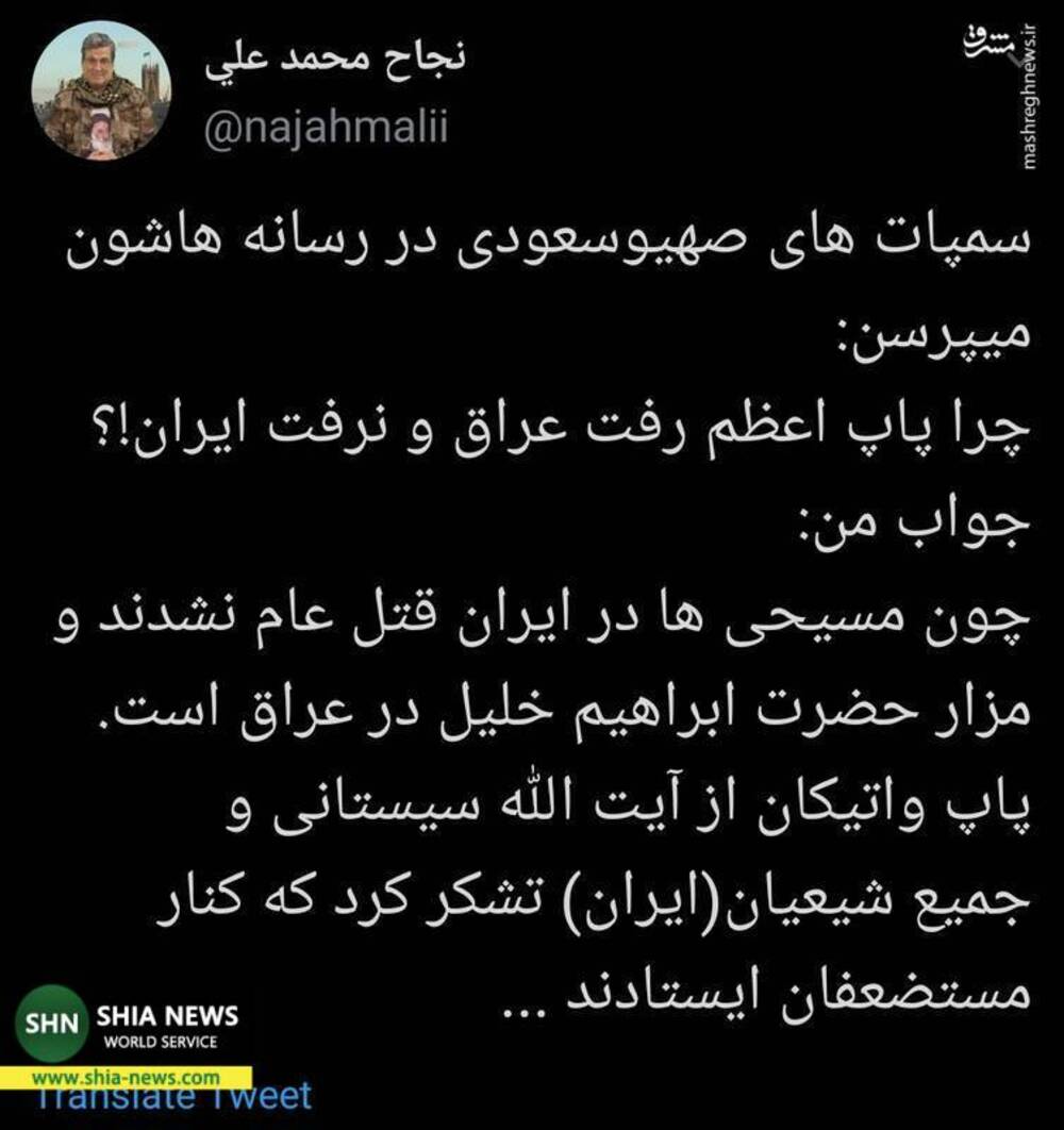 به گزارش «شیعه نیوز»، نجاح محمدعلی، تحلیلگر عراقی طی توییتی نوشت: ‏سمپات های صهیوسعودی در رسانه هاشون میپرسن: