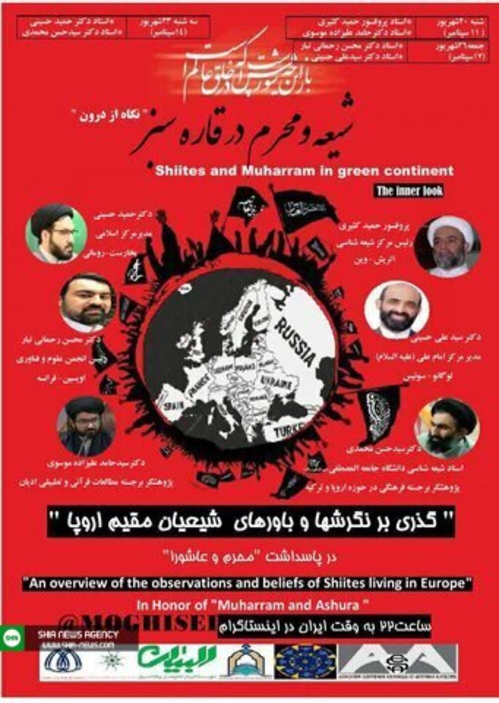 برنامه نشست گذری بر نگرش ها و باورهای شیعیان مقیم اورپا به این شرح است: شنبه ۲۰شهریور ( ۱۱ سپتامبر) استاد پروفسور حمید کثیری و دکترحامد علیزاده، سه شنبه ۲۳شهریور(۱۴سپتامبر) جناب دکتر حمید حسینی و دکتر سیدحسن محمدی ، جمعه۲۶شهریور(۱۷سپتامبر) دکتر محسن رحمانی تبار و دکتر سیدعلی حسینی.