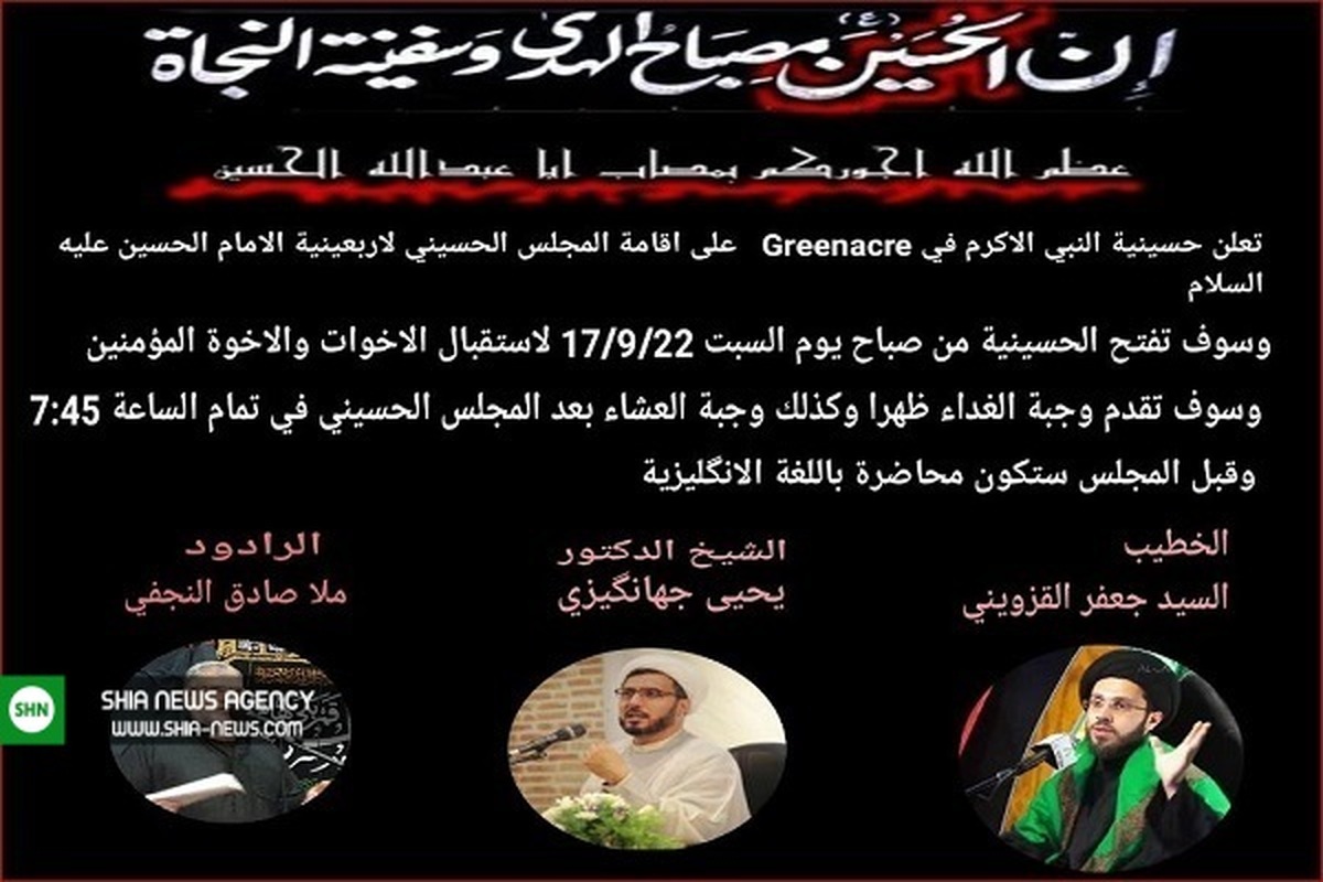 این برنامه روز شنبه، ۱۷ سپتامبر برابر با ۲۶ شهریورماه در حسینیه نبی اکرم(ص) سیدنی برگزار خواهد شد و با سخنرانی و مرثیهسرایی همراه است.
