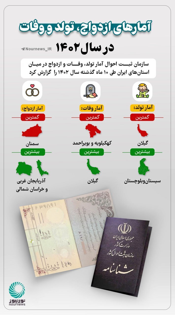 سازمان ثبت احوال کشور بیشترین و کمترین آمارهای تولد، فوت و ازدواج را در استان‌های مختلف را در ۱۰ ماه سال ۱۴۰۲ اعلام کرد.