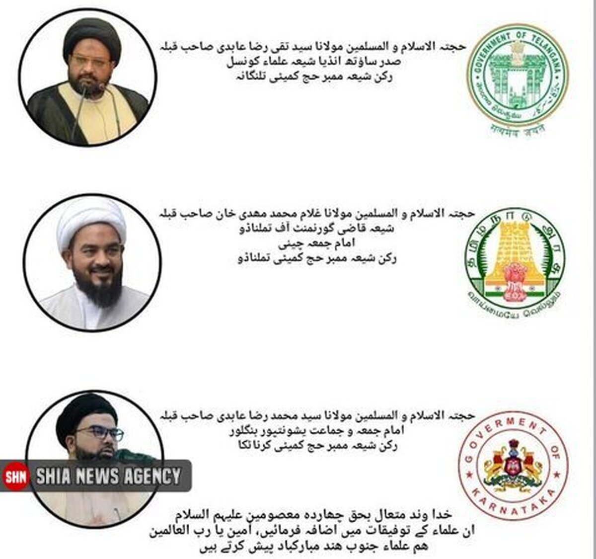حجت الاسلام و المسلمین سید تقی رضا عابدی، رئیس شورای علمای شیعه هند جنوبی، عضو هیئت کمیته حج تلنگانا، حجت الاسلام و المسلمین غلام محمد مهدی خان امام جمعه چنای عضو کمیته حج تمیلند و حجت الاسلام و المسلمین سید محمدرضا عابدی امام جمعه و جماعت بنگلور، بعنوان کمیته حج کارناتکا انتخاب شده اند.