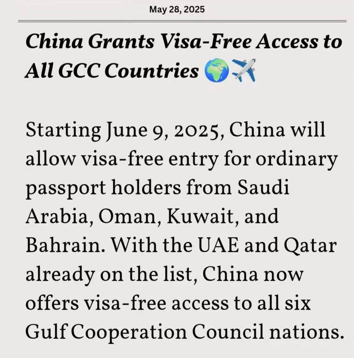 چین ویزای خود را برای شش کشور عربی حاشیه خلیج فارس به جز ایران را برداشت.