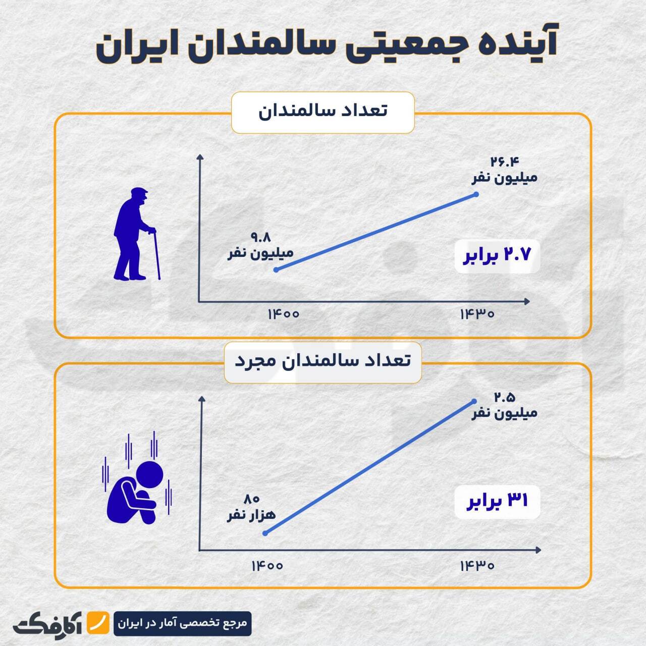 طبق پیش‌بینی‌ها تا ۳۰ سال آینده جمعیت سالمندان کشور بیش از دو برابر می‌شود. این در حالیست که جمعیت سالمندان مجرد رشد بسیار شدیدتری خواهد داشت و بیش از ۳۰ برابر می‌شود.