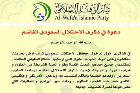 به گزارش «شیعه نیوز» به نقل از العالم، جریان اسلامی "الوفاء" امروز در بیانیه ای اعلام کرد: در نخستین سالگرد ورود نیروهای اشغالگر سعودی به خاک پاک بحرین، و خیانت بزرگ رژیم آلخلیفه، اقشار مختلف مردم از جمله علما و جوانان انقلابی، همگی قیام می کنیم.