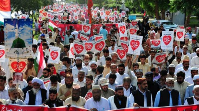 به گزارش «شیعه نیوز» به نقل از پرس تی وی، هزاران معترض به سمت پارلمان پاکستان در اسلام آباد، پايتخت اين کشور راهپيمايي کرده و خواستار محاکمه افرادي شدند که در توليد فيلم و انتشار کاريکاتورهاي ضد اسلامي نقش دارند.