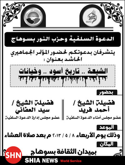 SHIA-NEWS.COM شیعه نیوز:به گزارش «شیعه نیوز» به نقل از ابنا، سلفی های تکفیری در پی القای این مطلب هستند که ایران در تلاش برای تبلیغ تشیع و تسلط بر مصر است در حالی که مذهب تشیع از دیرباز و از زمان فاطمیون در مصر بوده است. حتی نام دانشگاه الأزهر برگرفته از نام حضرت فاطمةالزهرا (علیهاالسلام) است. تا اینکه بعدها اهل تسنن بر مصر غالب شدند.در مورد خطر گسترش و نفوذ شیعه به مصر حتی «احمد الطیب» شیخ الازهر در گفتگو با یک روزنامه اماراتی با بیان اینکه با هیچ کدام از مسلمانان دشمنی ندارد گفت: اجازه گسترش تشیع در کشورهای عربی به ویژه مصر را نمی دهیم.