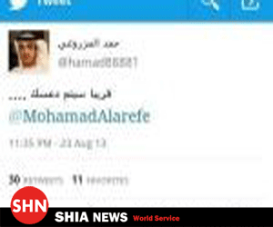 به گزارش «شیعه نیوز»، حمد المزروعی نویسنده و فعال اینترنتی اماراتی در یک توئیت بر صفحه شخصی تویتر خود "محمد العریفی" مفتی سعودی را تهدید به قتل کرده است.